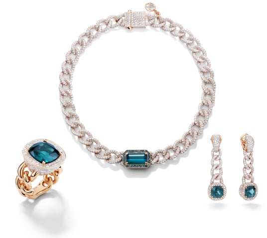ポメラートは、この稀少なストーンの魅力を引き出し、エレガントなパリュールの中心に配しています。長方形にカッティングされた10カラットのインディゴライトをセンターストーンにあしらい、その周りには203ものインディゴライトをセッティングし、さらに約2000のダイヤモンドがローズゴールドのグルメネックレスを輝かせています。