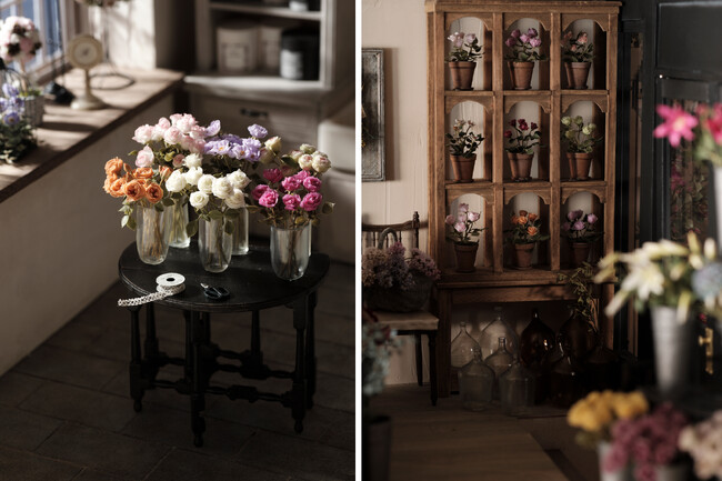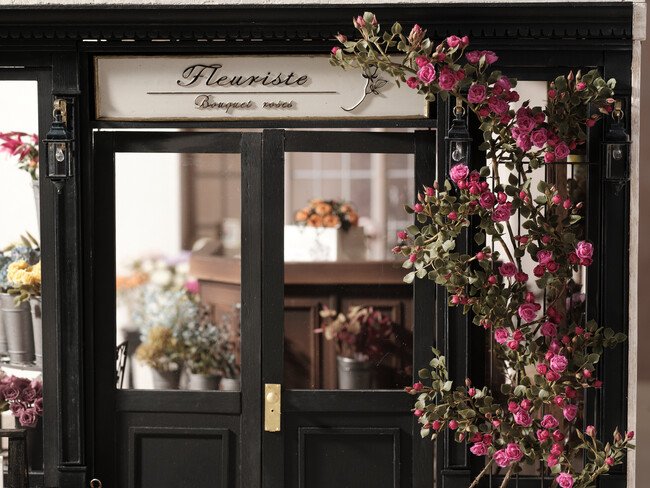 ここは、とあるパリのフラワーショップ。色とりどりの薔薇たちは、すべて樹脂粘土でつくられた1/12サイズのミニチュアローズです。