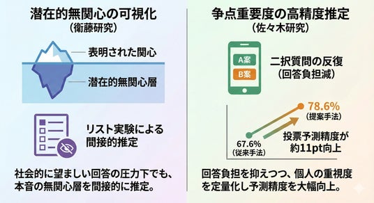 有権者が争点をどの程度重視しているかという個人レベルの争点重要度を、回答者の負担を抑えた二択質問の繰り返しから高精度に推定する新たな調査・分析手法を提示しました。階層ベイズモデルを用いることで、従来の世論調査では捉えにくかった重要度の強弱や個人差を定量的に復元できる点が特徴です。当社が実施した大規模調査データへの適用を通じ、投票行動分析や世論構造把握における予測精度の向上を実証しました。