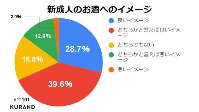 アンケートに回答した101名の新成人にお酒へのイメージを聞いたところ、28.7%が「良いイメージ」、39.6%が「どちらかと言えば良いイメージ」と回答し、全体の約68%が「お酒に良いイメージがある」と回答したことがわかりました。「良いイメージ」と回答した方の中には「家族がいつも楽しそうにお酒を飲んでいる」といった声があった反面、「悪いイメージ」と回答した方の中には、「身近に酒癖が悪い人がいる」といった声があり、家族など身近な人から影響を受けている可能性が高いことが考えられます。