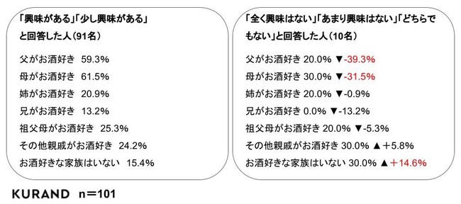 アンケートに回答した101名の新成人に家族や親戚にお酒好きな人がいるかを聞き、結果1.にてお酒に「興味がある」と回答した人と「興味がない」「どちらでもない」と回答した人で比較したところ、「興味がある」と回答した人の方が「興味がない」「どちらでもない」と回答した人に比べてお酒好きな家族がいる割合が高いことがわかりました。特に「父がお酒好き」は39.3%、「母がお酒好き」は31.5%の差があり、お酒好きな両親がいるとお酒に興味を持ちやすくなると考えられます。