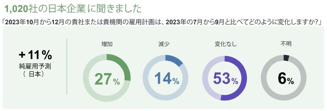 総合人材サービスのマンパワーグループ株式会社(本社・東京都港区、代表取締役社長:池田 匡弥、以下マンパワーグループ)は、2023年第4四半期(10-12月期)における企業の雇用計画を尋ねた「マンパワーグループ雇用予測調査」の結果を発表します。調査結果は「2023年10-12月において、貴社または貴機関の雇用計画(契約社員、派遣社員等を含む)は今期(2023年7-9月)と比べてどのような変化がありますか?」という質問に基づいています。尚、本調査はマンパワーグループが四半期ごとに行っている世界で最も広範囲(実施対象:41カ国・地域)にわたる事前調査です。