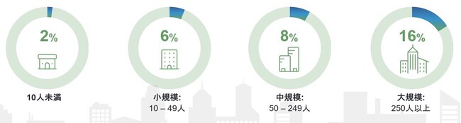 日本国内の組織規模別調査では、全ての組織規模で増員予定となっています。大規模組織が、前四半期比1ポイント増の純雇用予測+16%となり、最も高い雇用予測です。従業員数10人未満の組織は、前四半期比4ポイント減の純雇用予測+2%の結果となりました。