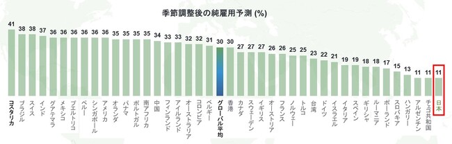 41カ国・地域すべてで、純雇用予測は、プラスと回答しています。日本は、アルゼンチン・チェコ共和国と並び、世界比較で最も低い雇用意欲の結果になりました。