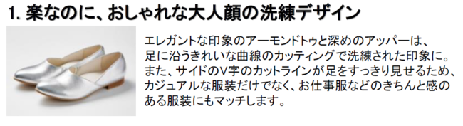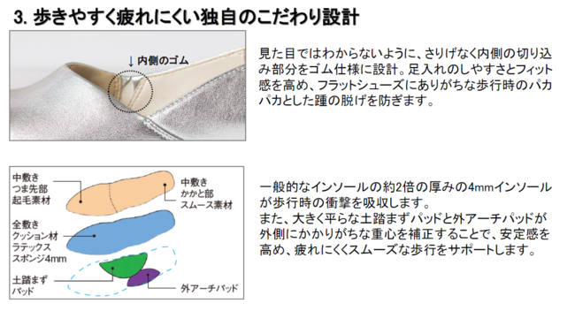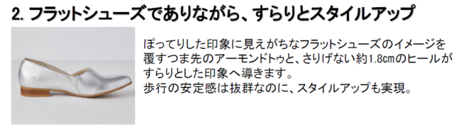 洗練されたデザインで、カジュアルな服だけでなく“きちんと感のある服にも合う”アーモンドトゥとサイドのカッティングですらりと“スタイルアップ”。吸いつくような履き心地で“歩きやすく疲れにくい”デザイン性と機能性を兼ね備えた新発想のフラットシューズの誕生です。