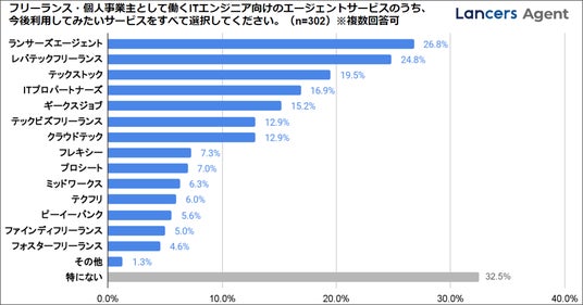 ITエンジニアに今後利用してみたいエージェントサービスを伺ったところ、『Lancers Agent(ランサーズエージェント)』がトップという結果だった。