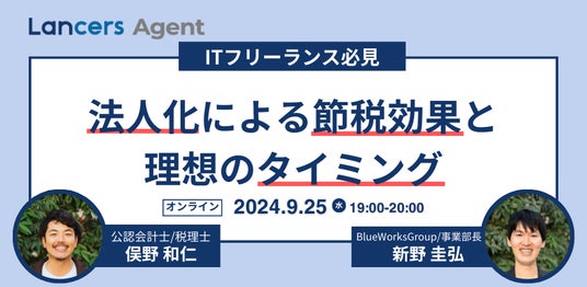 『Lancers Agent(ランサーズエージェント)』では、法人化を検討しているITフリーランスを対象に、法人化のポイントやその効果について詳しく解説する勉強会を開催いたします。個人事業主から法人設立を考えるフリーランスの方々が増える中、費用や手続きに対する不安や課題が多く寄せられており、これに応える形で勉強会の開催を決定いたしました。