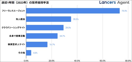 『Lancers Agent(ランサーズエージェント)』が過去に行った調査(※3)の結果、フリーランス/個人事業主として働くITエンジニアが案件を獲得する方法は、フリーランスエージェントを利用することが一番多いことがわかった。