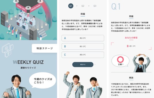 QuizKnockが得意とする “クイズ” には、一見興味のないことにも「答えはなんだろう?」と考えることで知的好奇心が湧き上がり、その周辺にも興味を持つことができる、といった特徴があります。さらに、クイズを作る=作問することで、その物事をより深く学び、理解することができます。「ゼロエミッションスクール」特設サイト( https://zero-emission-school.jp/ )でも、エネルギーや環境に関するクイズを毎週出題する「今週のクイズ」や、QuizKnockメンバーとともに一つの問いに取り組み、エネルギーについて理解を深めるスペシャル動画など、 “クイズ” を用いたコンテンツを通して、エネルギーの未来について楽しく考えるきっかけを提供しています。