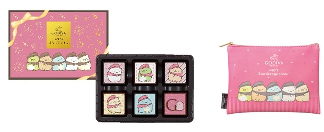 さらに、ゴディバの制服をまとった『すみっコぐらし』の人気キャラクター達が描かれた限定チョコレートをアソートした「ゴディバ × すみっコぐらし アソートメント」では、ポーチ付きのアイテムも登場します。
