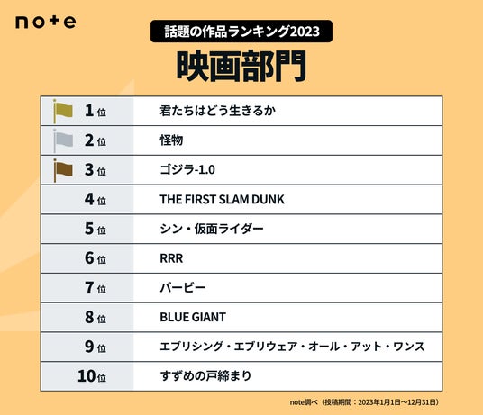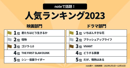 2023年の1年間でnoteへ投稿された、映画やドラマの感想記事を集計しました。映画とドラマの2部門に分けて、noteで話題の作品ランキングを発表します。映画部門では第96回アカデミー賞で長編アニメーション賞にノミネートされている『君たちはどう生きるか』、ドラマ部門はsilentでお馴染みの脚本家・生方美久さんが手がけた『いちばんすきな花』が第1位となりました。以下、ランキングの詳細です。