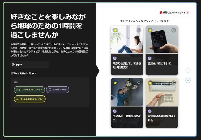 EARTH HOUR特設ウェブサイトで紹介する10個のアクティビティの中から、ご自身のライフスタイルにあった活動をお選びいただきます