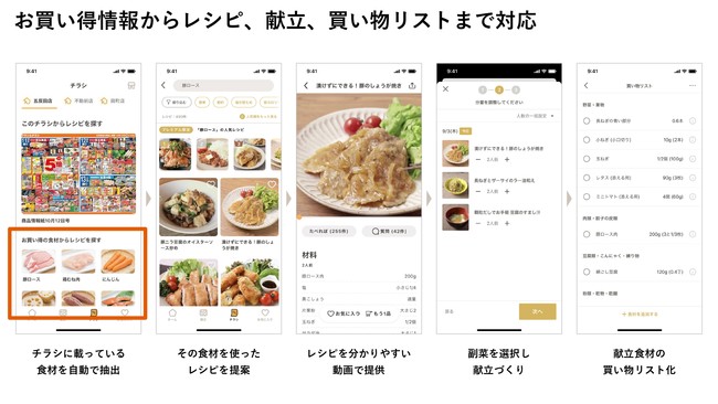 「クラシル」アプリ内および専用Webに、店舗ごとの電子チラシを掲載しています。電子チラシから商品を自動抽出し、クラシルが保有する45,000件以上のレシピコンテンツから自動でおすすめのレシピを提案します。提案されたレシピからの献立とお買物リストの作成も可能です。