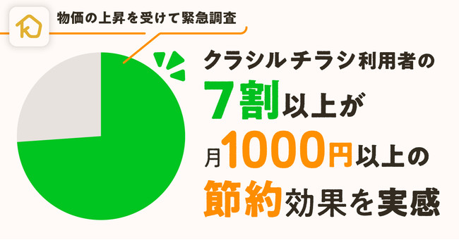 また、「クラシル」内の電子チラシ閲覧機能「クラシルチラシ」の利用者の7割以上が、本機能を活用することにより、月に1,000円を超える節約効果を実感しています。