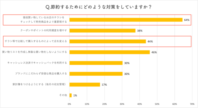 回答者の6割以上が節約のために「チラシでお買い得な商品を確認」、4割が「複数店舗のチラシを比較」