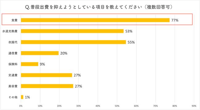 その結果、半数以上が「物価の上昇を受けて生活費を見直した」と回答し、最も出費を減らしたい項目として「食費」が選ばれました(77%)。
