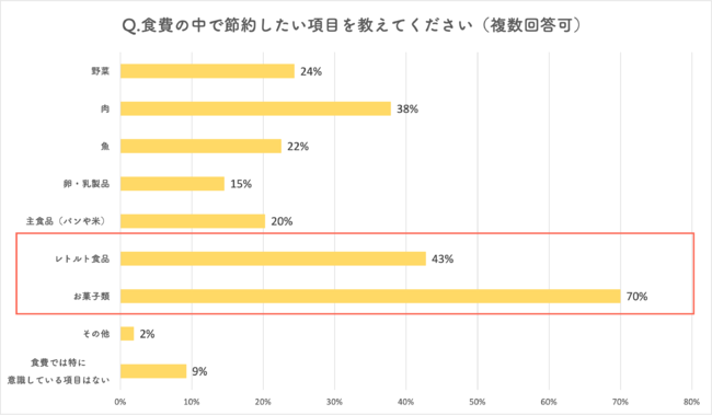 食費の中でも出費を抑えたい項目として「菓子類」(70%)が最も多く挙げられました。手軽ではあるものの単価の高いレトルト食品、同じく単価の高い肉類も買い控えの傾向が見られます。