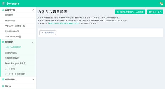 Syncableが昨年9月より提供している「カスタム項目」機能では、NPOが寄付フォームに独自の質問を設定し、寄付者に対してより詳細な確認を行うことができます。例えば、寄付者の名前を公開する許可を求めたり、反社会的勢力に関わりがないことに同意してもらう項目を追加することが可能です。この機能を活用することで、団体のニーズに応じた柔軟な設定ができ、寄付者とのコミュニケーションを最適化します。