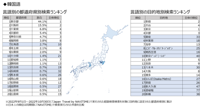 韓国語利用者では、上位2都府の東京、大阪を足すと約6割を占め、東京、大阪を目的地にした検索の偏りが大きいことがわかります。北海道、大分などで、全体の傾向よりも検索順位が高くなっています。具体的な目的地では、ユニバーサル・スタジオ・ジャパン、東京ディズニーランドといったテーマパークが上位であること、銀座、秋葉原、原宿、新大久保やなんば、道頓堀など東京、大阪で人気の場所への検索が多いことも特徴的でした。