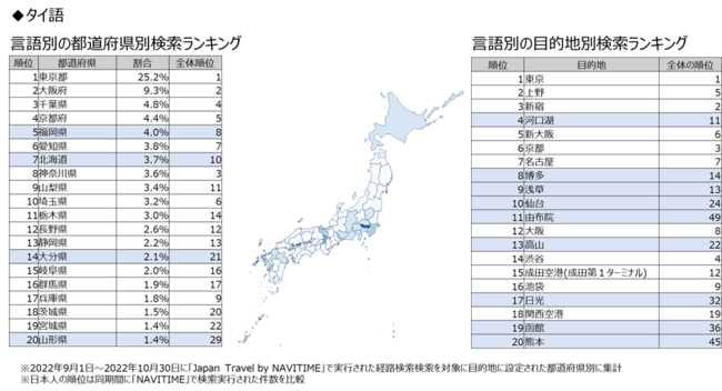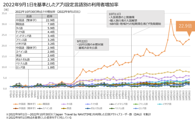 アプリの設定言語別に利用者数の変化をみると、9月1日を基準にした伸び率では、中国語(繁体字)が最も高く、2022年10月30日時点で9月1日の22.9倍の利用者数となっています、韓国語、タイ語利用者も7.8倍、5.9倍の伸びが見られ、台湾、香港、韓国、タイでの訪日旅行への関心の高まりがうかがえます。