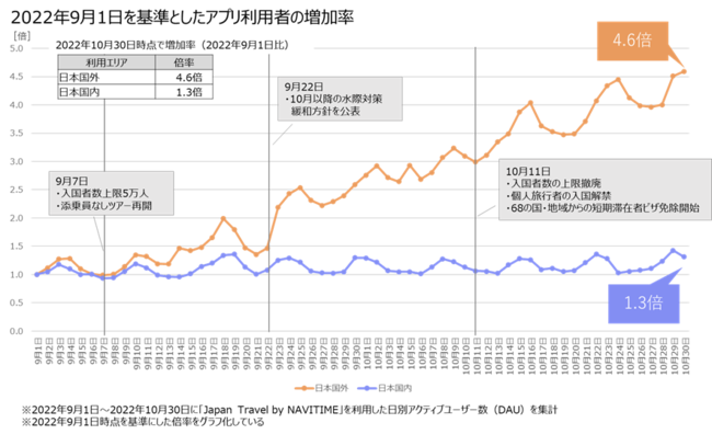 2022年9月以降のアプリ利用者数について、9月1日時点での利用者数を基準とした増加率を分析しました。9月22日に10月以降の水際対策大幅緩和の方針が発表されて以降、日本国外からの利用者数が急増しており、訪日旅行への需要の高まりが表れています。