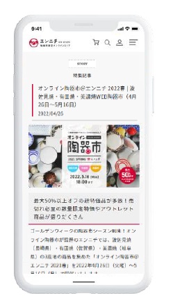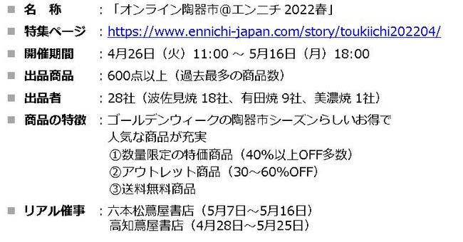 株式会社ふくおかフィナンシャルグループ(取締役社長 五島 久、以下「FFG」)傘下のiBankマーケティング株式会社(代表取締役社長 明石俊彦、以下「iBank社」)は、「地域総合商社事業」におけるオンラインストア「エンニチ」を活用した取組みとして『オンライン陶器市@エンニチ 2022春』を開催いたします。