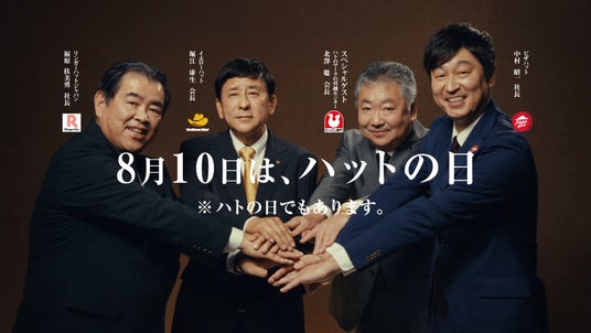 日本ピザハット株式会社(代表取締役社長: 中村 昭一)、株式会社イエローハット(代表取締役会長: 堀江 康生)、リンガーハットジャパン株式会社(代表取締役社長: 福原 扶美勇)、全国引越専門協同組合連合会(会長:北澤 聡、以下 ハトのマークの引越センター)は8月10日(土)の「ハットの日」に向け、「ハット首脳会談」を開催。今年はハトのマークの引越センターも加わり、「ハット・ハトの日」としてパワーアップした新TVCM「ハット首脳会談2024ハト篇」を8月5日(月)より放映いたします。
