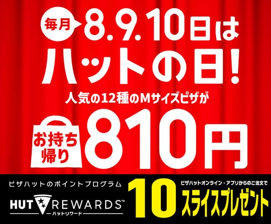 毎月8・9・10日を「ハットの日」と定め、人気のMサイズピザ8種類をお持ち帰り限定で810円という超おトク価格で提供いたします。また、今年の8月8・9・10日のハットの日は首脳会談を記念して選べるピザを4種類増やし“12種類を810円で販売”いたします!さらに、当該期間にご注文のピザハットオンライン・公式アプリの会員の皆様へ2024年9月1日(日)まで使用可能なピザハットのメンバーシッププログラム「HUT REWARDS(ハットリワード)」でのポイントである「スライス」をプレゼントいたします!