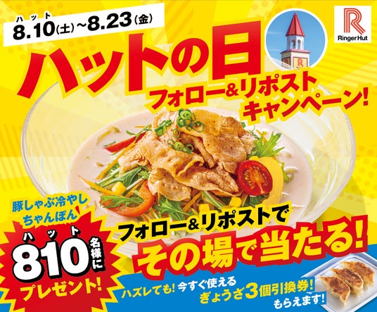 8月10日(土)~8月23日(金)に、その場で当たる「フォロー&リポストキャンペーン」を実施。リンガーハットX(旧Twitter)公式アカウントをフォローし、対象投稿をリポストすると、抽選で810名様にリンガーハット店舗で使える冷やしちゃんぽん1杯無料引換券が当たります。ハズレでもぎょうざ3個引換券が当たるお得なキャンペーンにぜひご参加ください。