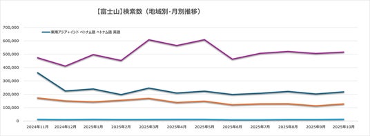 2位のインドでは、自然景観と文化体験を重視する層が増えており、富士山はその両方を満たす観光地であるために検索を牽引している可能性があります。また、 InstagramやYouTubeなどSNSで富士山の絶景や登山体験が拡散されており、特に桜や雪景色と富士山の写真はインドの旅行者に人気です。さらに、2025年3月に富士山の登山規制や料金改定が海外メディアで報道されたことも、検索数増加の一因と考えられます。