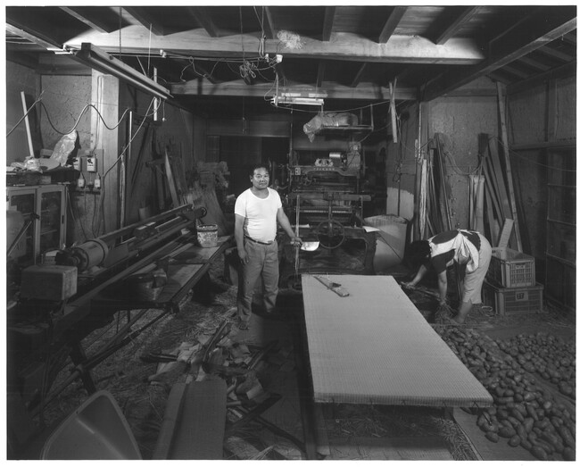 〈田淵畳店/鳥取県八頭郡河原町渡一木/1985(昭和60)年/近郷では知られた畳作りの名人。発砲スチロールやナイロンの畳の多い中、昔ながらのい草で、畳作りを続ける。右下に写っているジャガイモをお土産に頂いた。〉