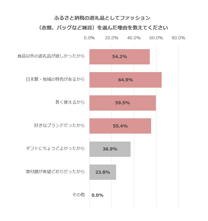 ふるさと納税でファッションアイテムを選んだ理由として、最も多かったのは「日本製・地域の特色があるから」(64.9%)でした。
