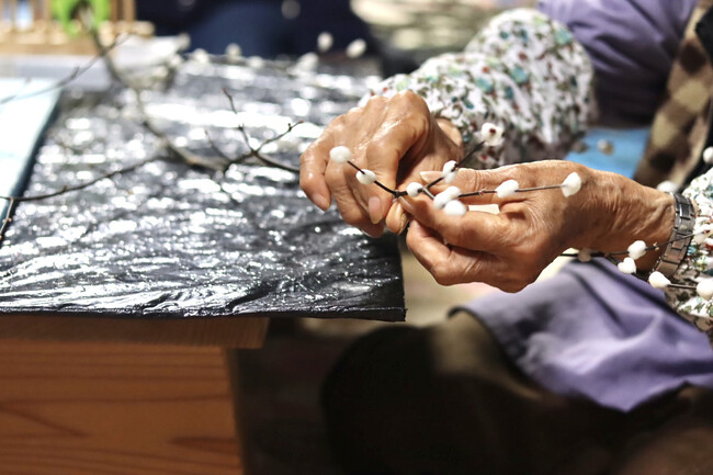 「花餅」は、花の少ない冬の季節を華やかにし、新年の無病息災を祈る飛騨高山の伝統文化です。餅をついて紅白の餅を枝につけていく楽しい「花餅」づくりを体験できます。