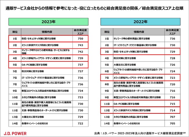 昨年調査では、「テレワーク時の便利用品に関する情報」をあげた顧客の総合満足度が最も高かったが、本年調査では「防犯・セキュリティ対策に関する情報」をあげた顧客の総合満足度が750ptとなり、最も高い結果となった。また「オフィス家具やデスク収納に関する情報」や「オフィス移転やレイアウト・デザイン変更に関する情報」、「OA・PC機器に関する情報」が上位5つに入った。