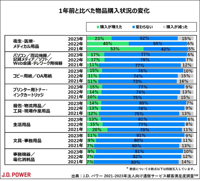 一方で、コロナ禍で購入が落ち込んだ「コピー用紙/OA用紙」や「プリンター用トナー・インクカートリッジ」、「文具・事務用品」等の物品は、「購入が減った」という回答が減少のトレンドにある。