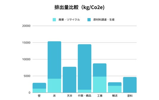 スタートアップ企業に人気のスケルトン仕様の天井などにより、「床」,「天井」,「什器・備品」の「原材料調達・製造」にともなう削減貢献量が多い結果となりました。