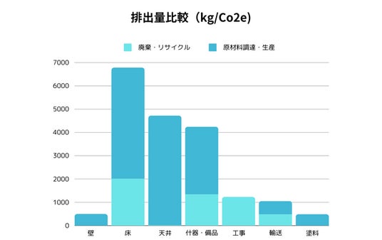 異なる内装にも関わらず、どちらも「床」の原材料調達・生産によるCO2削減貢献量が多い結果となりました。このように通常、オフィス移転では原状回復工事が必須となることから、オフィス移転とCO2排出は密接な関係にあると言えます。