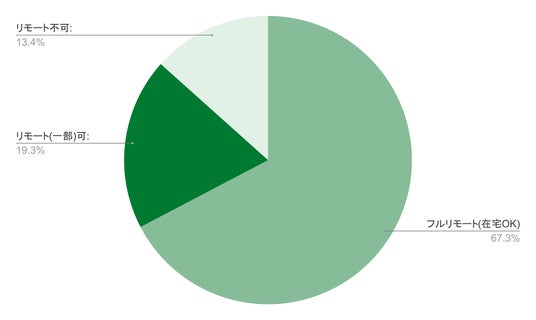 フルリモートが67.3%と約7割を占め、一部リモート可を含めると86.6%がリモート対応可能です。