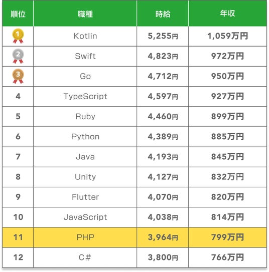 SOKUDANに掲載されているPHP案件の平均年収は799万円です。職種別年収ランキングでは12位中11位ですが、一般的なエンジニアの年収水準と比較すると高い報酬といえます。