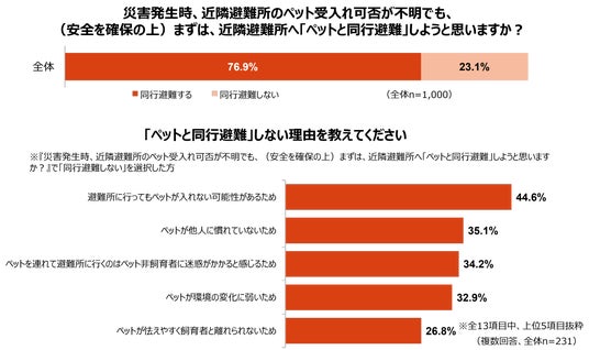 災害時の同行避難に関する意向調査では、76.9%の飼育者が「同行避難したい」と高い意欲を示していることが明らかになりました。一方で、同行避難をしない飼育者の最大の理由は「避難所に行ってもペットが入れない可能性があるため」が44.6%で最多となり、受入れ体制への不安が大きな壁となっています。