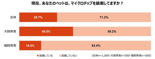 マイクロチップ装着率は全体で28.7%の結果となりました。2022年6月、動物愛護管理法の改正により、ブリーダーやペットショップ等では犬や猫へマイクロチップの装着が義務づけられました。既に飼育している方については、努力義務となりますが、マイクロチップはペットとはぐれたときにも有効な手段となり、防災対策としても活用できます。