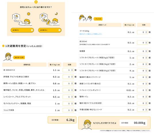 被災状況別シミュレーションでは、発災時に自身とペットの身に起きることをイメージし、安全確保のために取るべき避難方法などを状況別に確認できます。また、物量シミュレーションでは、一時避難持ち出しに必要な物資の量を家族・ペットの構成別に試算でき、物資の準備対策をより具体的に行うことができます。