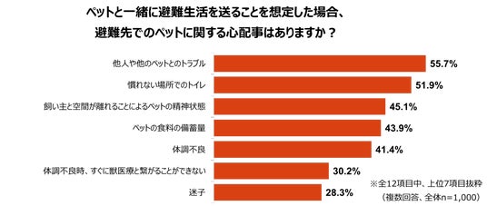 避難先での心配事は「他人や他のペットとのトラブル」が55.7%で最多となり、次いで「慣れない場所でのトイレ」が51.9%にのぼりました。その他、ペットの精神状態や健康状態を不安視する声も一定数あり、共同生活下でのストレスや周囲への配慮が課題となっています。