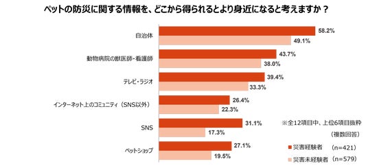 ペット防災の情報を得られるとより身近になる窓口は「自治体」が最多で、次いで「動物病院の獣医師・看護師」や「テレビ・ラジオ」が上位を占めました。また、災害経験者は未経験者に比べ、SNSに対しても「身近になる」と回答する割合が高い傾向にありました。有事の備えを自分事化するためには、信頼性の高い公的機関を軸としつつ、飼育者が日常的に接する多様な経路を組み合わせた情報提供が必要かもしれません。