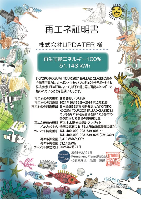 社会の仕組みをサステナブルにアップデートする事業を展開する株式会社UPDATER(所在地:東京都世田谷区、代表取締役:大石英司)は、小泉今日子さんが2024年10月26日から12月21日にかけて全国16都市21公演で開催した「TOUR 2024 BALLAD CLASSICS」に協賛し、カーボンオフセットプロジェクトを支援いたしました。本プロジェクトでは、ツアー運営に係る主な二酸化炭素の排出量を算出し、排出した約120t-CO2をJ-クレジット活用によって実質ゼロにしました。約120t-CO2は、平均的な家庭40世帯分の年間排出量に相当します(※)。今回カーボンオフセットの対象としたのは、会場の使用電力(約23t 再エネ換算53,145kWh)、出演者、スタッフの移動(約45t)、出演者、スタッフの宿泊(約27t)、機材の運搬(約20t)に関するCO2排出量となります。