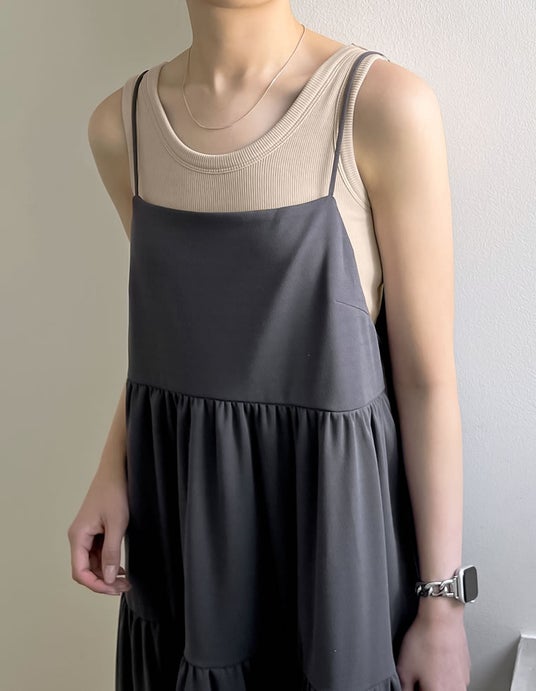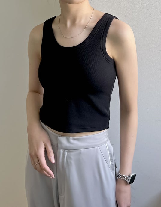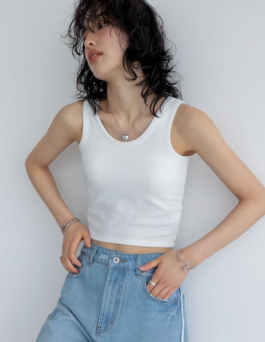 肌に心地よくフィットするカップ付きのリブタンクトップ。