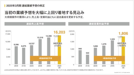 大規模案件の獲得により、当初の業績予想を大幅に上回り、売上高・営業利益ともに過去最高を更新する予定となっています。