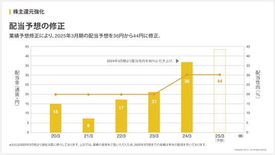 業績予想修正により、2025年3月期の配当予想を36円から44円に修正いたします。