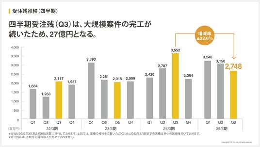 四半期受注残は大規模案件の完工が続いたため、2,748百万円となりました。