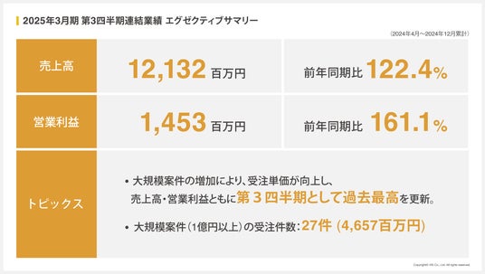 ・大規模案件の増加、受注単価の向上などにより、売上高・営業利益ともに第3四半期として過去最高を更新しました。